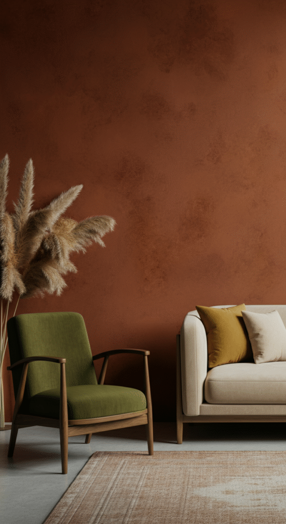 Think terracotta, mustard, olive green, deep teal, faded rust, creamy whites. These anchor the space and keep it calm and cosy.