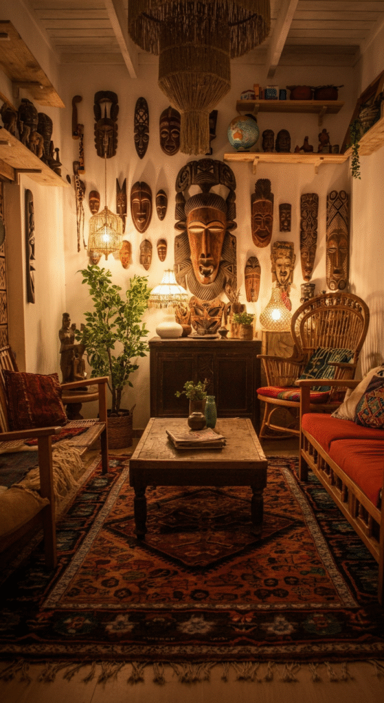 These pieces give your space uniqueness: a carved stool from a flea market, a Moroccan rug, wooden masks or frames from a trip. They anchor the space in story rather than showroom-uniformity.
