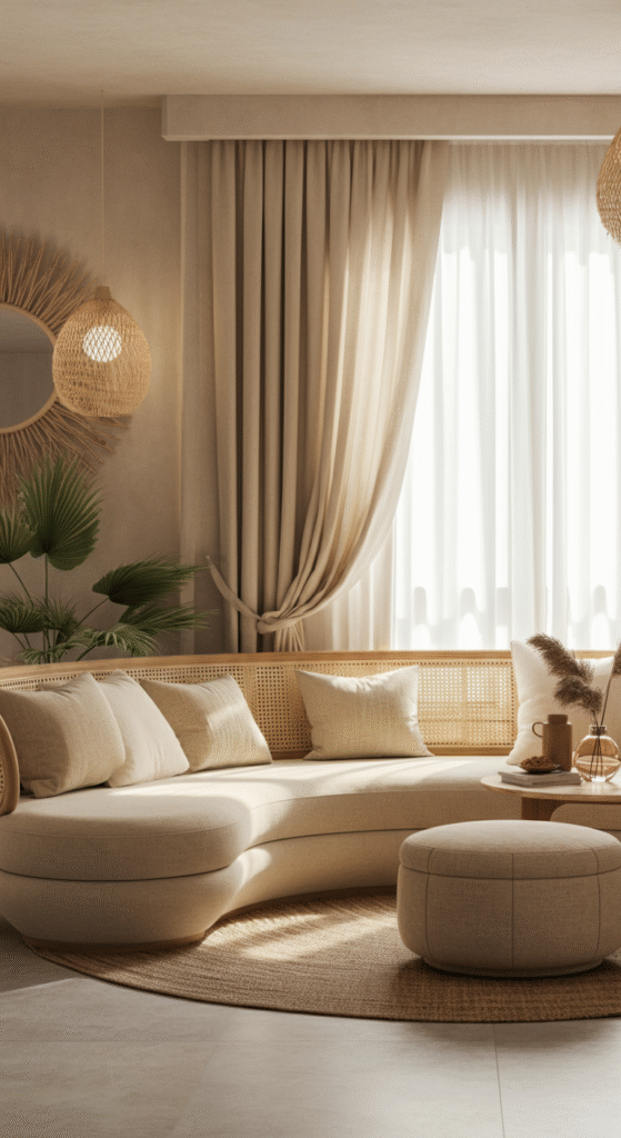 Layer organic textures like rattan, jute, and linen while keeping the palette earthy. Add plants and ambient lighting for a relaxed flow without clutter.