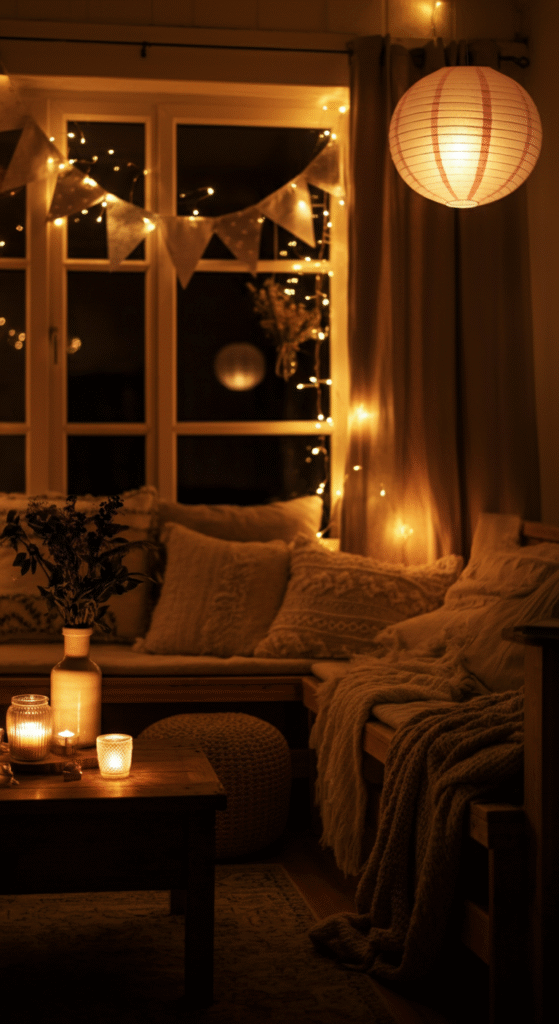 Tip: Use at least three types of light: overhead (if needed), task (reading corner), and accent (candle/lantern). Choose bulbs in the warm white spectrum (2700–3000 K) for a cozier feel.