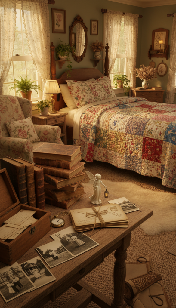 Cottagecore bedrooms feel real because they hold personal stories. Old books. Family photographs. Letters. A trinket from travel.