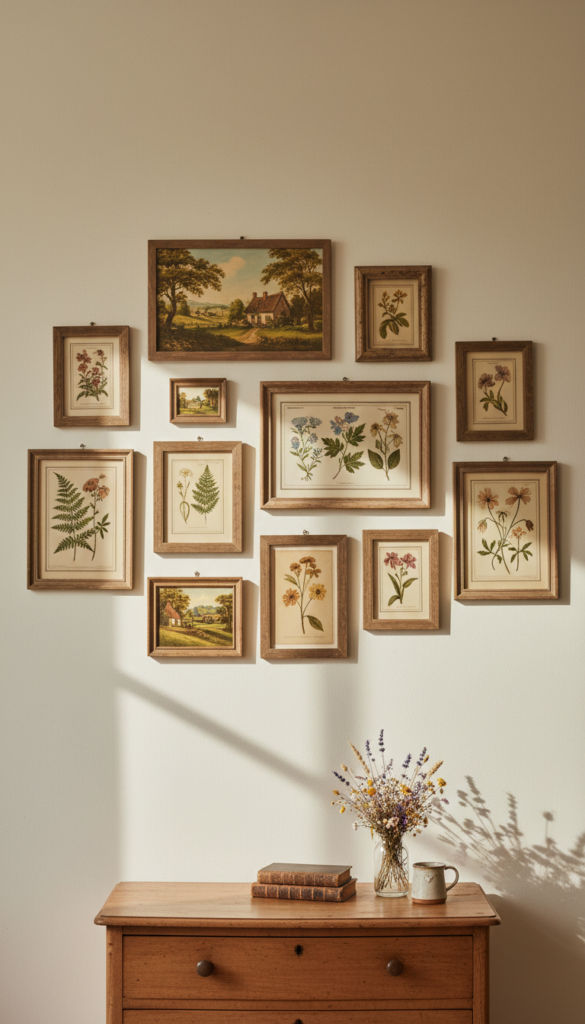 Choose a few meaningful pieces. Botanical prints. Old looking landscapes. Handwritten poetry. Pressed flowers in simple frames.