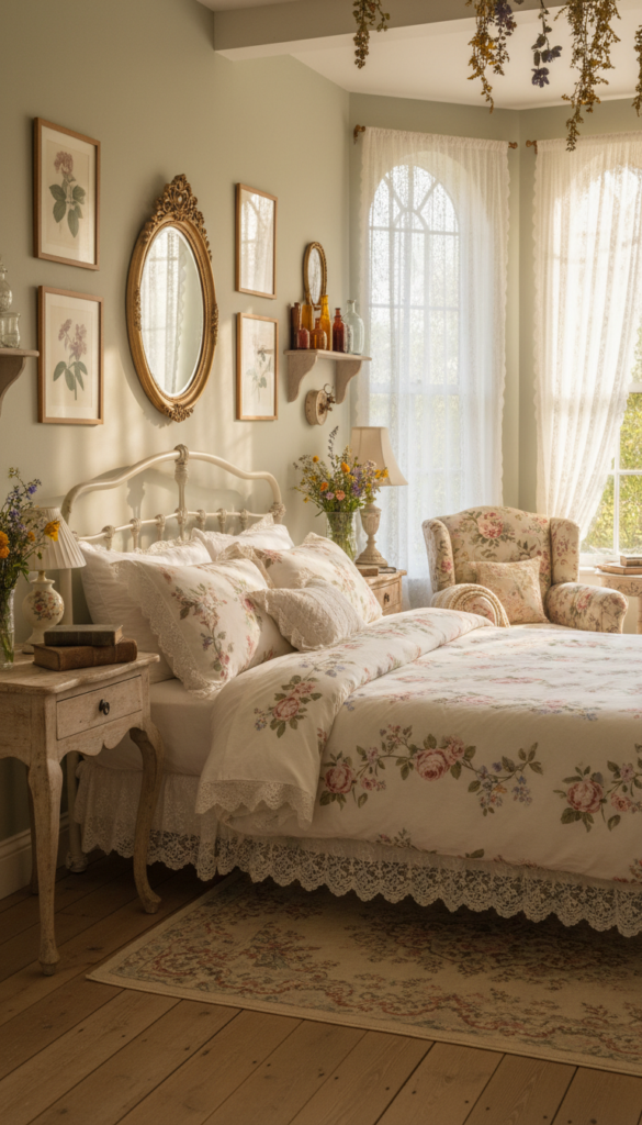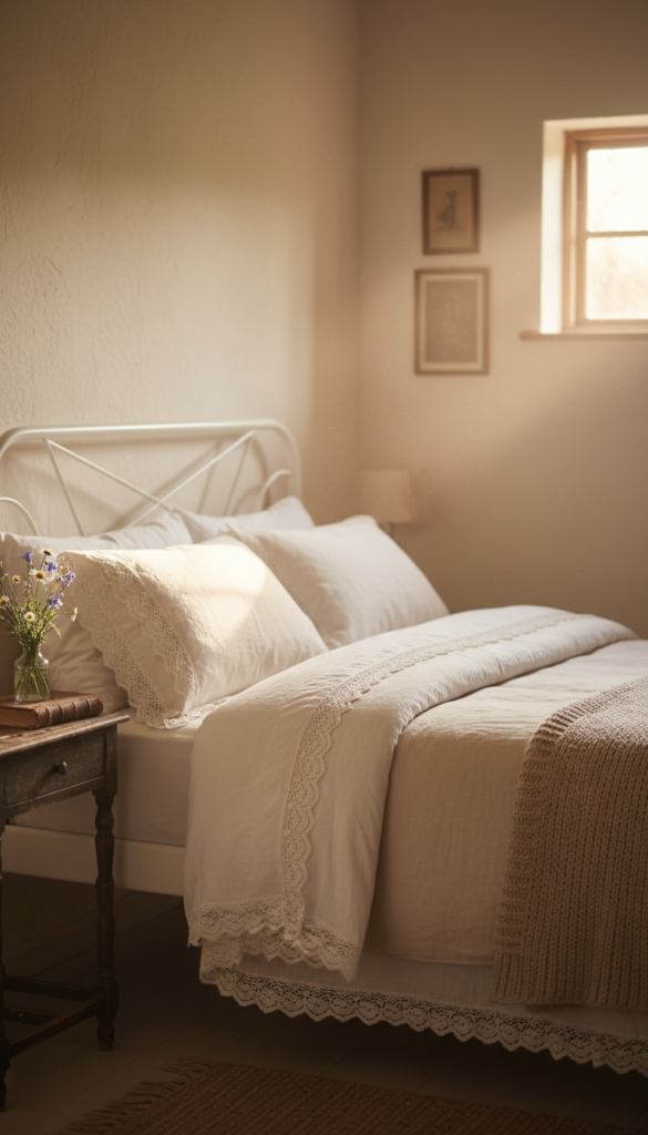 10. Romantic Cottagecore Bedroom with Lace and Embroidery