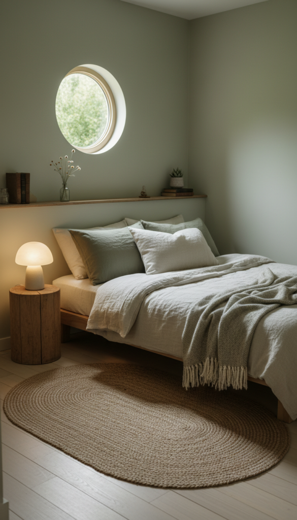 A simple bed, one bedside table, soft bedding, and gentle lighting are enough.