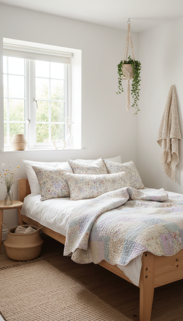 It turns a small room into a soft retreat where slow mornings, handwritten notes, floral fabrics, and warm light feel natural again.