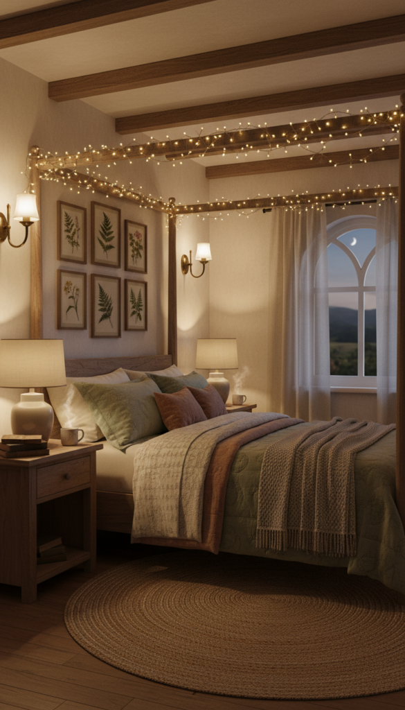 A cottagecore bedroom aesthetic focuses on comfort, nature, and nostalgia. It uses soft colors, natural fabrics, vintage elements, and cozy lighting to create a calm and romantic space.