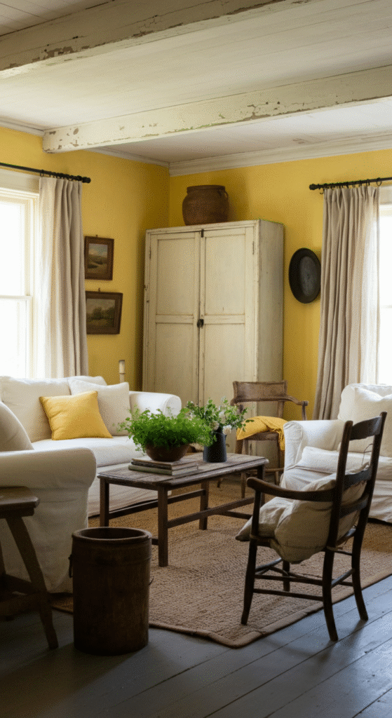 Antique yellow walls — slightly muted and vintage in tone — pair exceptionally well with distressed wood furniture. This combination celebrates imperfection, patina, and history — the heart of farmhouse design.