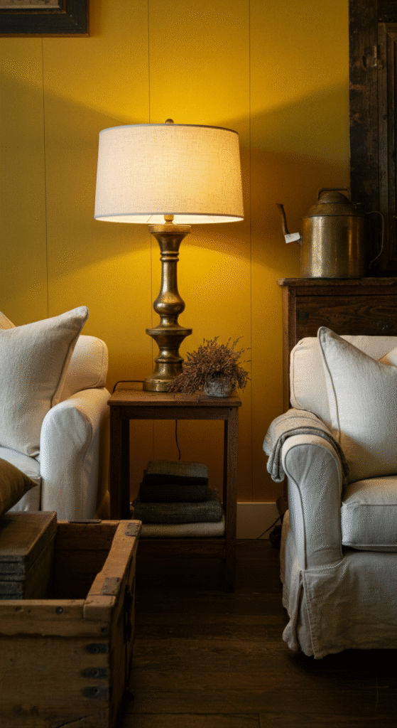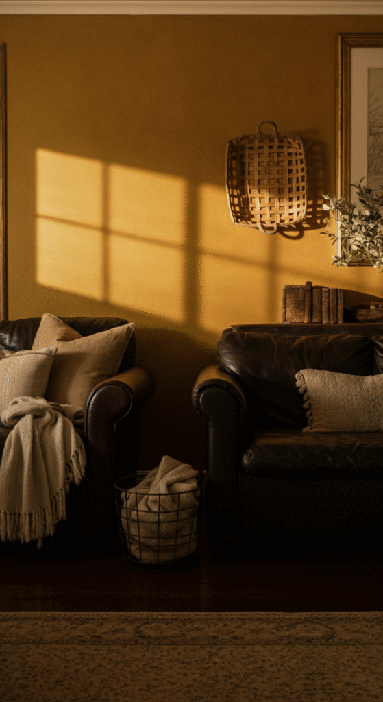 To complete the look, add textured throw blankets, woven baskets, and an oversized farmhouse clock. The mix of golden walls and rustic décor instantly makes the space feel comforting and nostalgic — like a modern farmhouse with a touch of history.