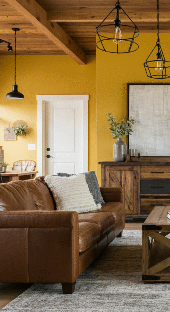 Try pairing mustard walls with black metal light fixtures and a distressed leather sofa for a blend of warmth and modern character. The contrast between rustic textures and deep yellow walls creates a look that’s cozy yet contemporary.