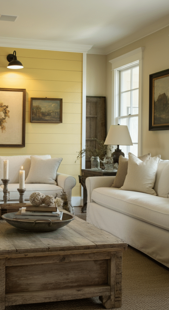 A soft butter-yellow wall can do wonders for a living room that craves natural light and serenity. This subtle hue pairs beautifully with white shiplap, distressed wood furniture, and linen upholstery.
