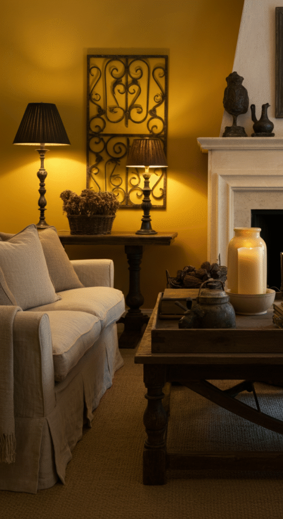 Pair ochre walls with antique furniture, linen slipcovers, and wrought-iron décor for a refined yet cozy atmosphere. Add vintage artwork or botanical prints for an extra layer of authenticity.