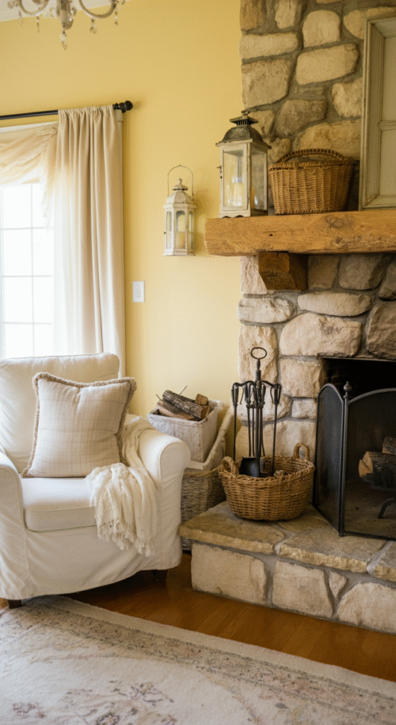 Decorate the mantle with rustic lanterns, framed farm prints, and woven baskets for a perfectly curated farmhouse vignette. The combination of stone texture and yellow warmth instantly creates a space where everyone wants to gather.