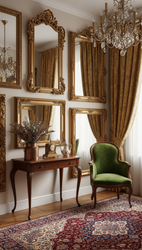 Mirrors do more than check your outfit; they reflect light and add a sense of history. An ornate, gold-framed mirror is a staple of vintage decor.