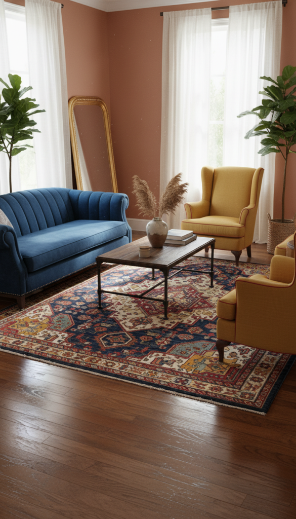 Carpet is fine, but a patterned area rug adds instant color and anchors the room. The “distressed” look mimics the wear of a true antique without the fragility.