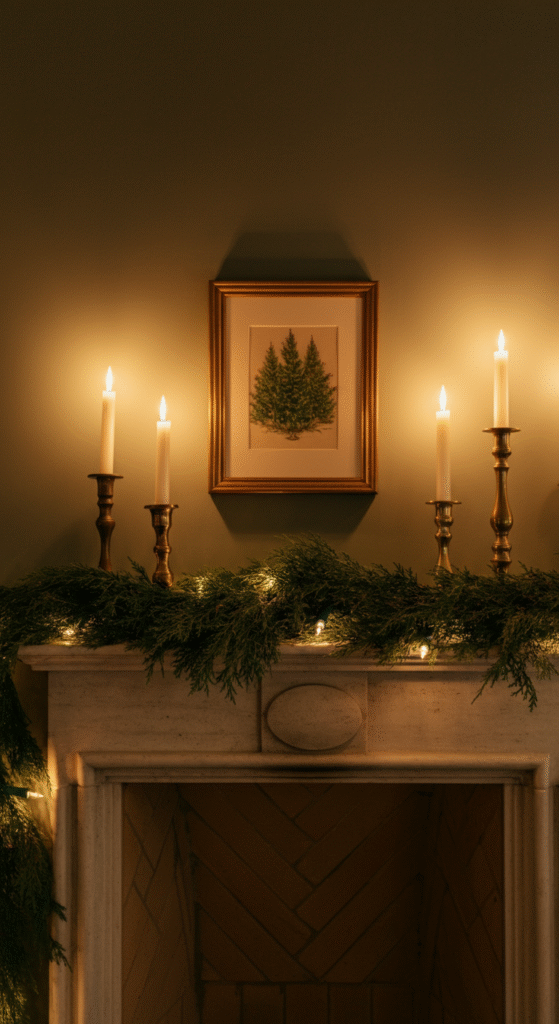 Two elegant candlesticks on each side, a thick garland across the base, and a central focal piece like a framed holiday artwork can build the entire setup effortlessly.