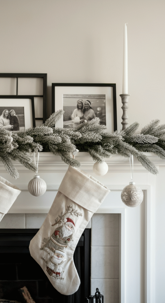 This mantle celebrates memories, not just décor. Use framed photos, handcrafted ornaments, embroidered stockings, and meaningful trinkets collected over the years.