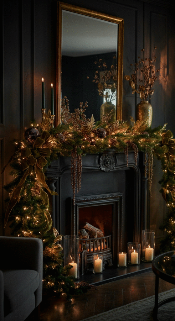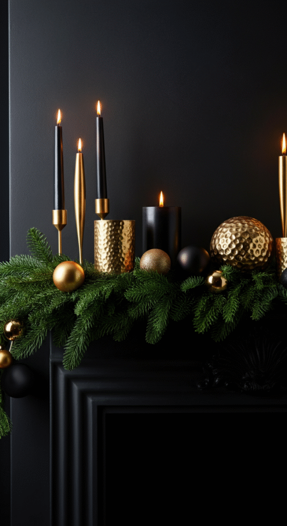 A sleek black frame, gold candles, metallic garlands, and matte ornaments create a cohesive and luxurious look. It’s the kind of mantle you’d see in a premium hotel lobby or luxury penthouse.
