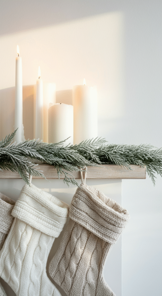 If you prefer a clean, refined visual style, Scandinavian design is unbeatable. This mantle focuses on minimal décor pieces — white candles, wooden accents, neutral stockings, and a frosted garland.