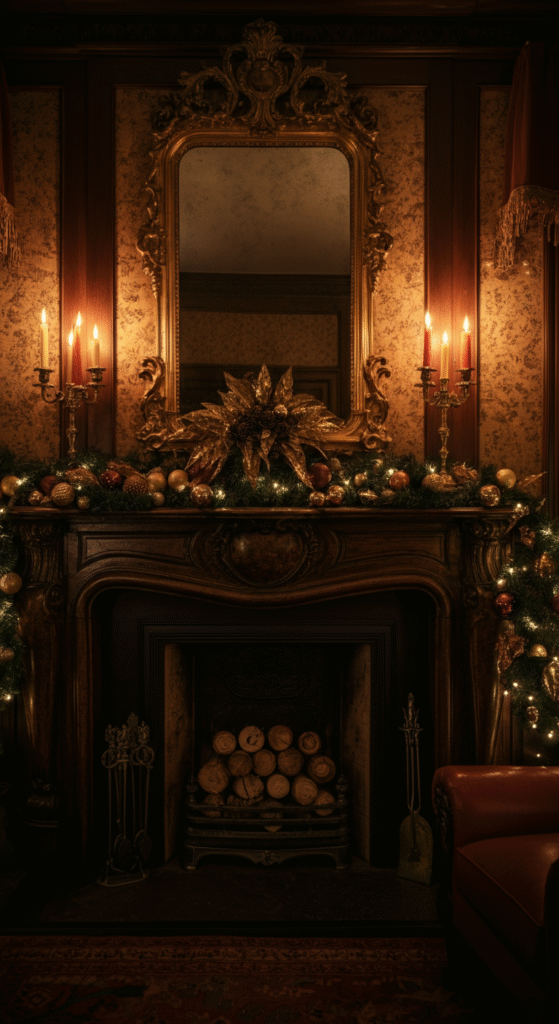 If your home leans toward a sophisticated, old-world charm, a vintage brass mantle is the striking choice. Use antique candle holders, gold mirrors, metallic garlands, and warm-toned lights.