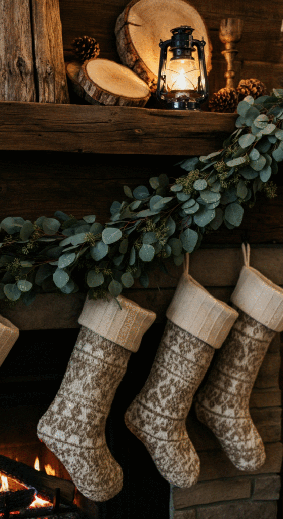 This design is for people who love the feeling of a cozy winter cabin. Use pinecones, wood slices, lanterns, eucalyptus, and neutral-toned stockings. Focus on textures — wood, wool, greenery, and stone.