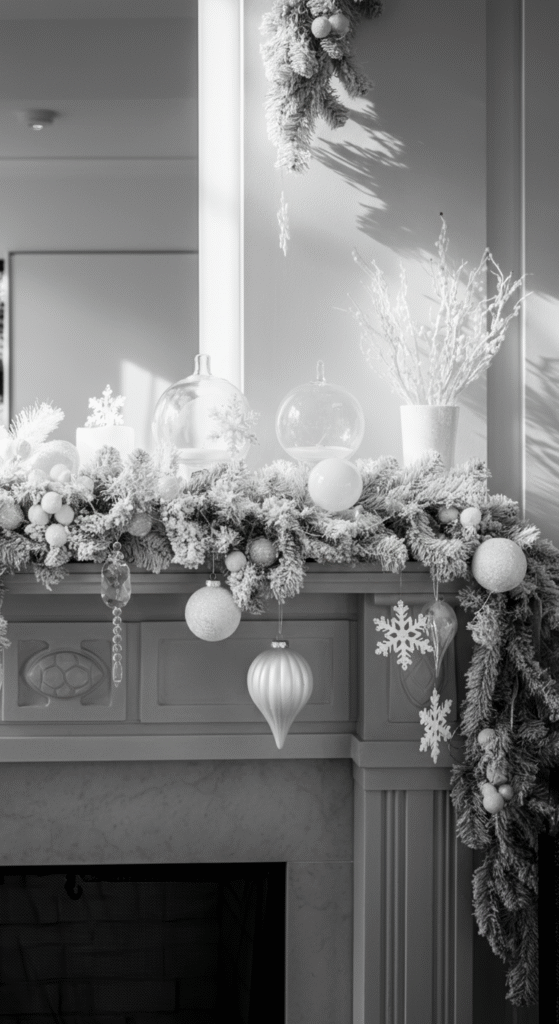 A monochrome white mantle creates a striking winter-wonderland aesthetic. Use frosted garlands, white ornaments, snowflake cutouts, and clear glass accents.