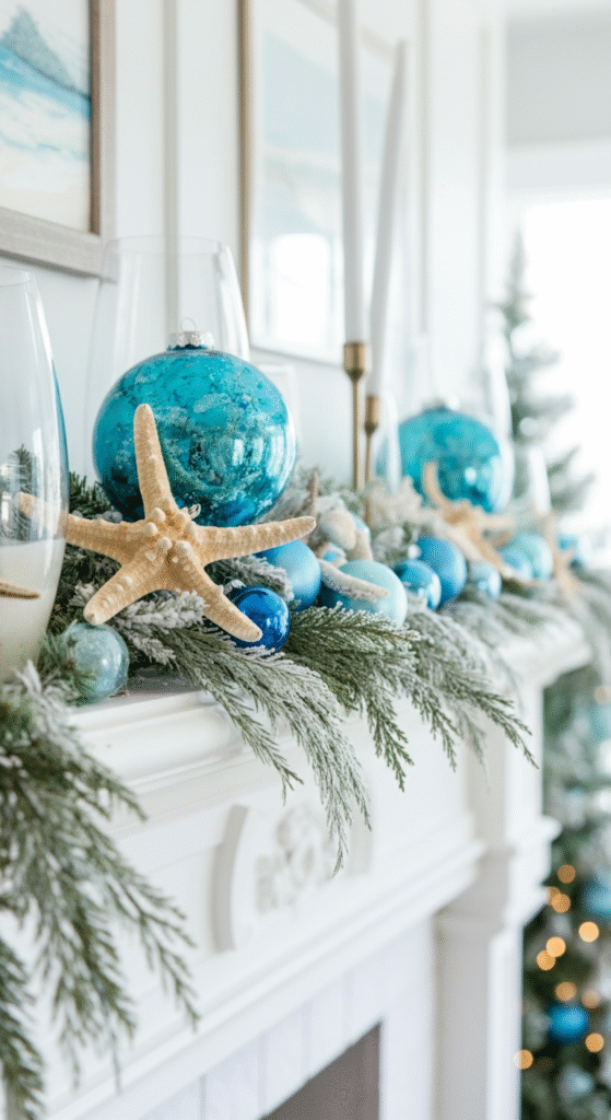 If you want something fresh, calm, and out of the ordinary, go for a coastal-themed Christmas mantle. Use ocean-inspired blues, sandy whites, driftwood accents, seashell ornaments, and frosted greenery.