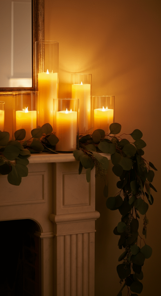 Use varying candle heights, glass containers, LED flameless candles, and symmetrical placement. Add a thin greenery garland behind them for a subtle touch.