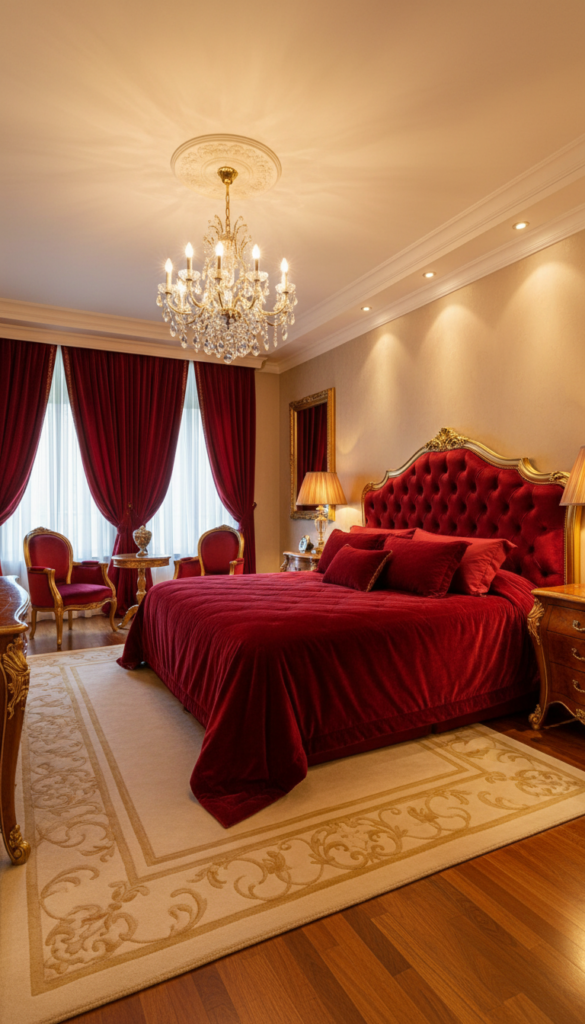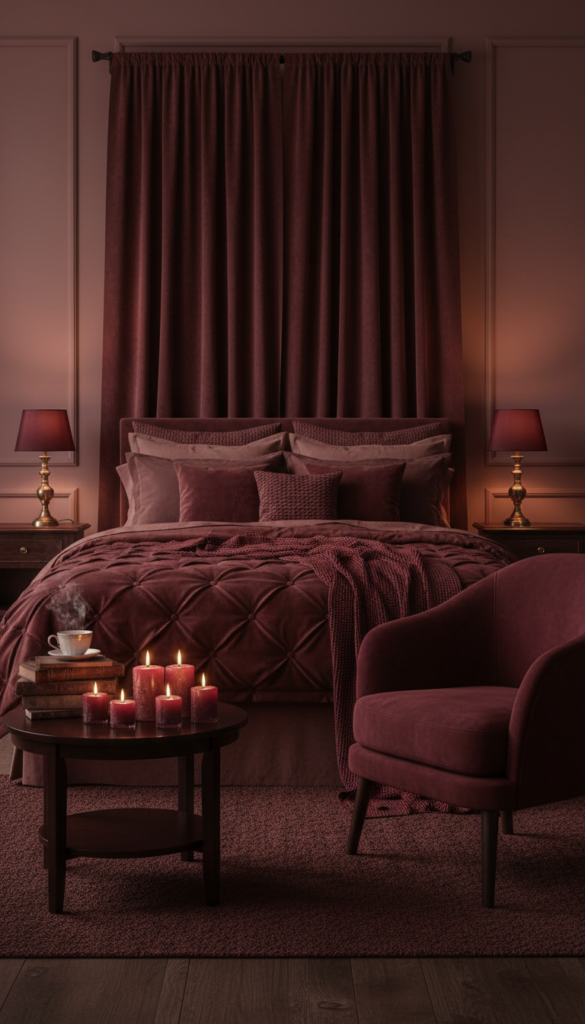 This look focuses on deep, jewel-toned reds paired with luxurious textures. It creates a cozy, intimate atmosphere perfect for relaxation.