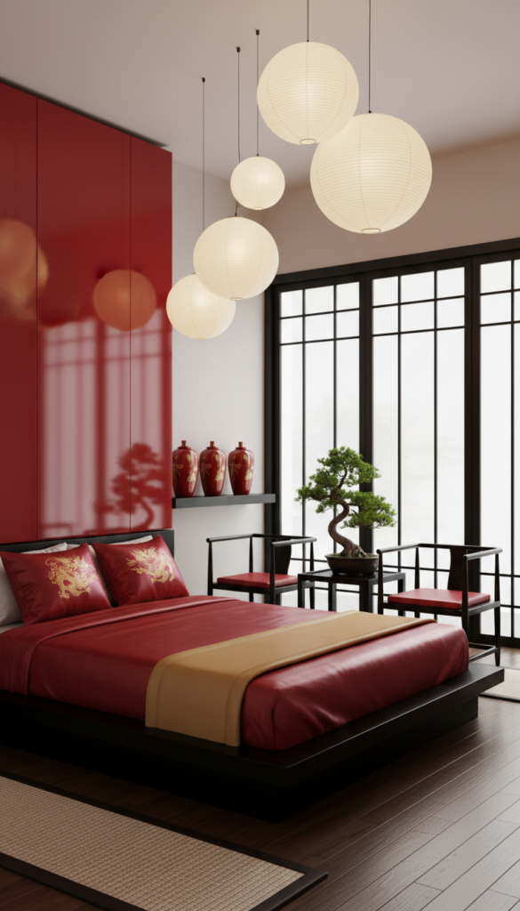 Drawing inspiration from Asian design, this look uses red lacquer, black accents, and symbols of luck and prosperity for a serene vibe.
