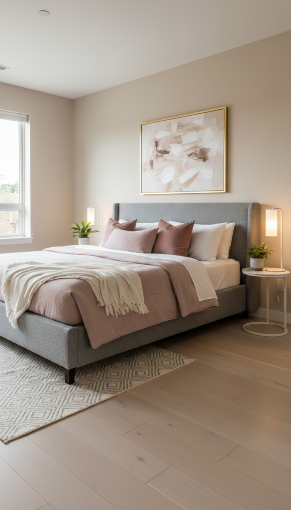 - Combine blush or muted red textiles with cool grey tones.