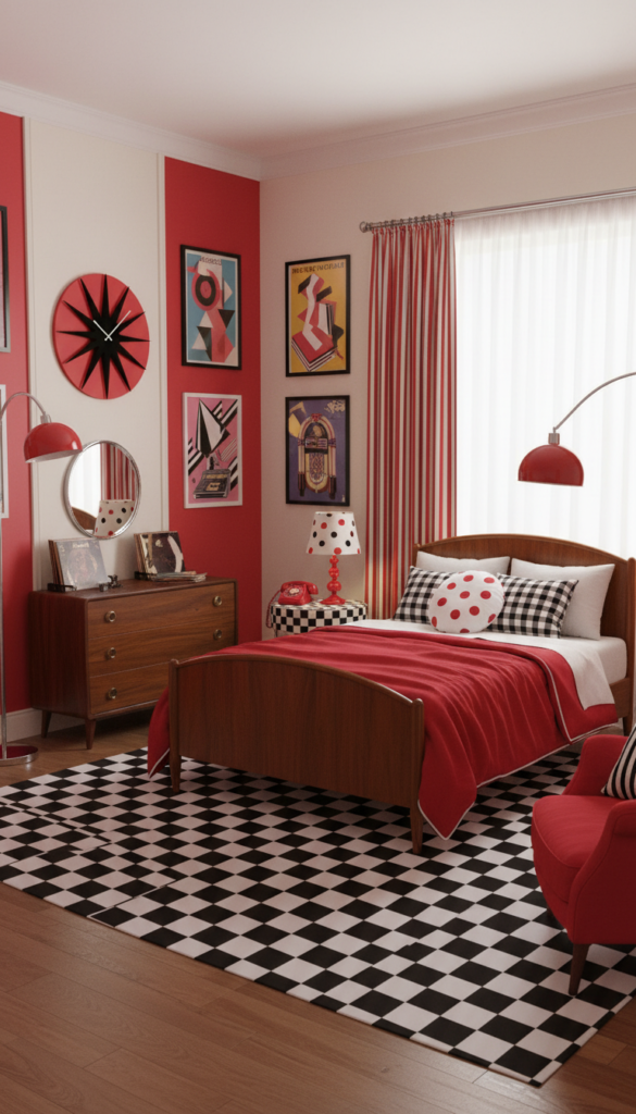 Channel the vibrant energy of the 1950s with bright cherry red, checkerboard patterns, and vintage-inspired decor.