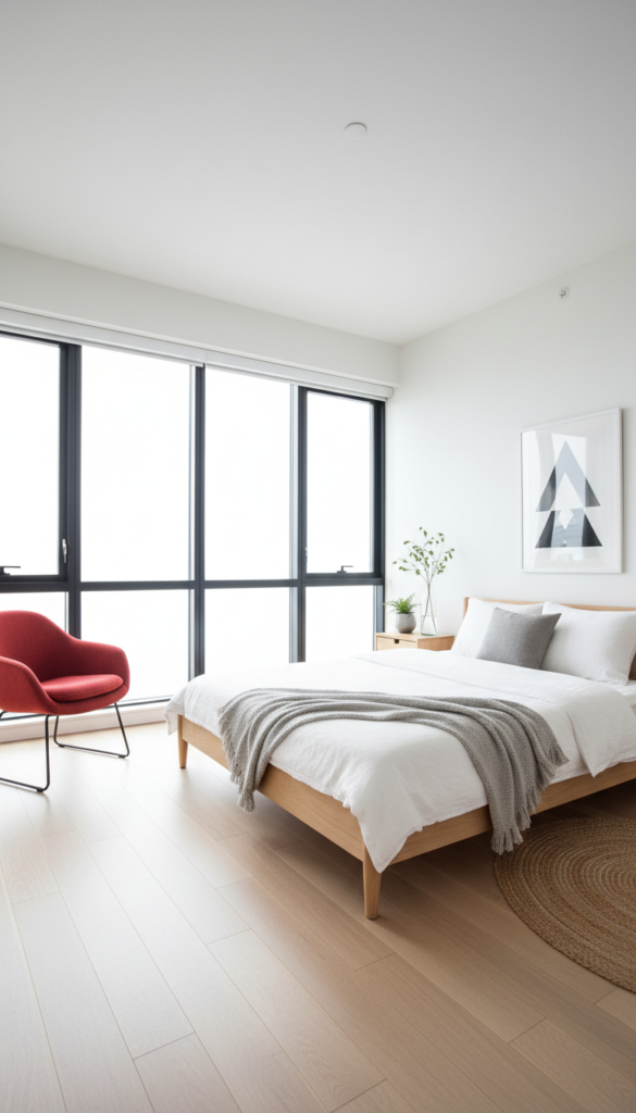 Keep the room mostly white and airy, using a few bold red items as focal points to create a clean, modern aesthetic.