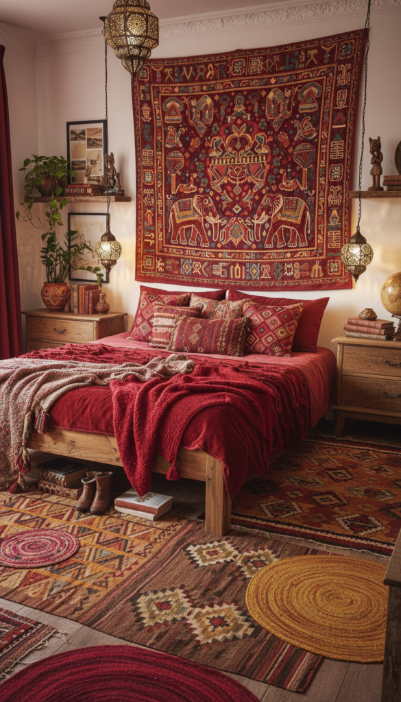 Inspired by global travels, this look mixes deep berry reds with vibrant patterns, tapestries, and eclectic decor.