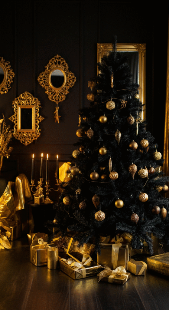 If you’re someone who loves drama and sophistication, a black and gold Christmas room design will surely make a statement. Bold black walls or furniture paired with gold accents and holiday decor create a stunning contrast that feels both edgy and refined. Gold-dipped ornaments, a black Christmas tree, and metallic gold picture frames can transform your room into a contemporary, glamorous space.