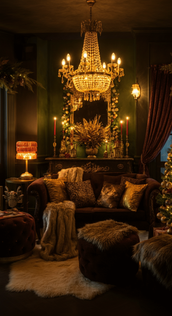 To bring this look to life, pair your velvet and faux fur accents with metallic finishes and soft lighting. The combination of luxurious materials and textures will make your Christmas room feel inviting and opulent.