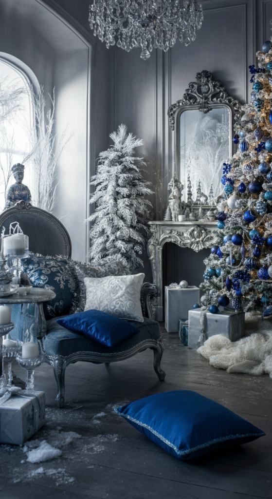 To make this look even more glamorous, add glistening silver garlands, crystal chandeliers, and mirrored furniture. The key is to balance the cool silver tones with soft textures like faux fur or velvet to keep the room inviting and warm.