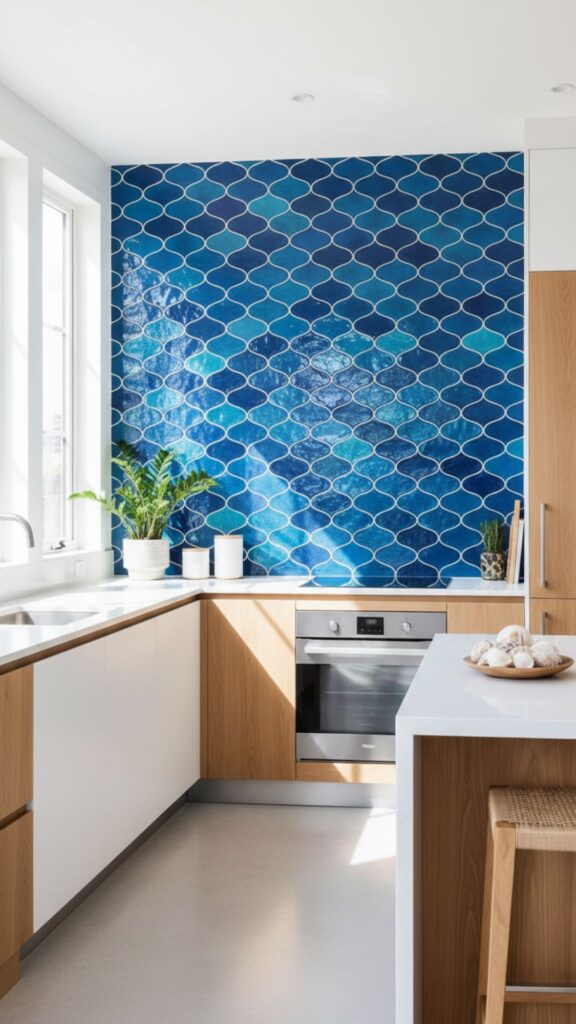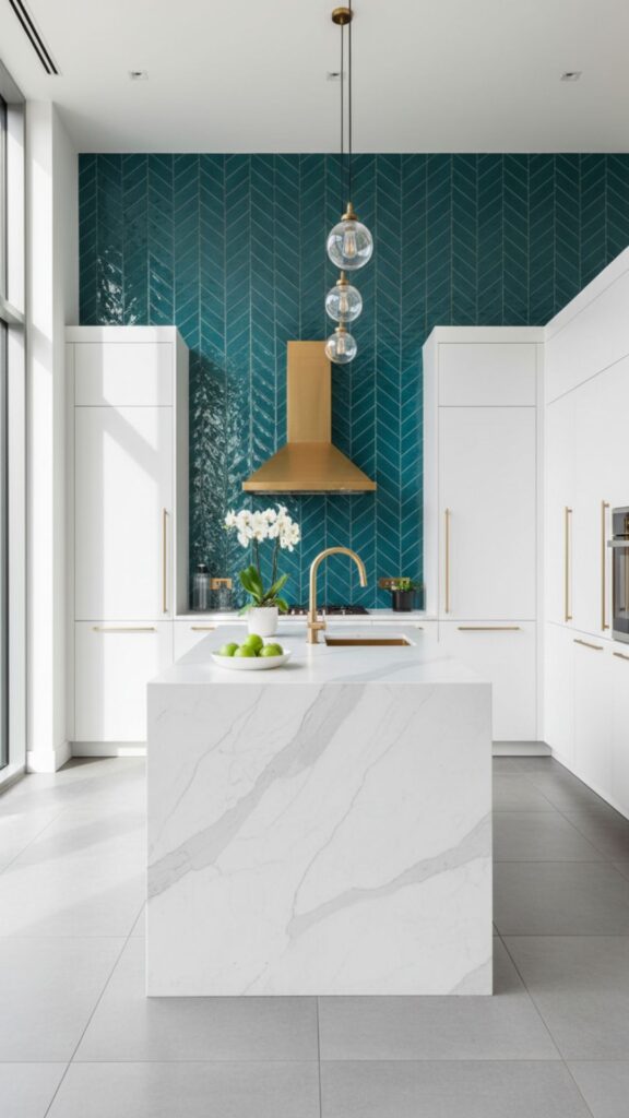 Inject personality into your kitchen with a pop of color. A deep teal in a herringbone pattern feels luxurious and aquatic, perfect for creating a focal point.