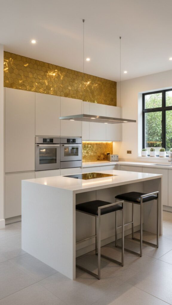Nothing says luxury like gold. Glossy metallic hexagon tiles reflect warm tones, making the kitchen feel inviting yet expensive.