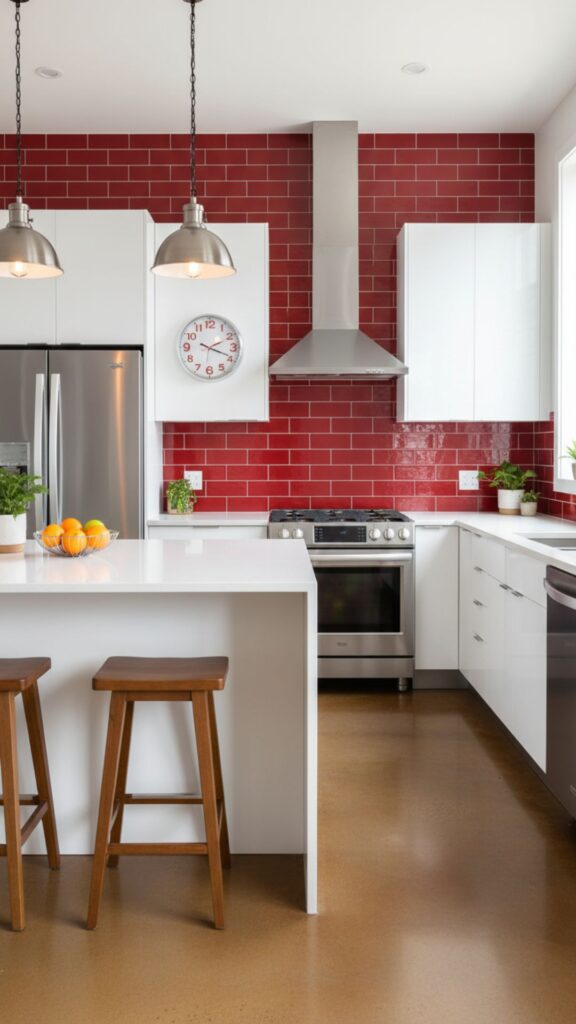 A high-gloss red backsplash is energetic and stimulates the appetite. It’s a retro-modern look that demands attention.