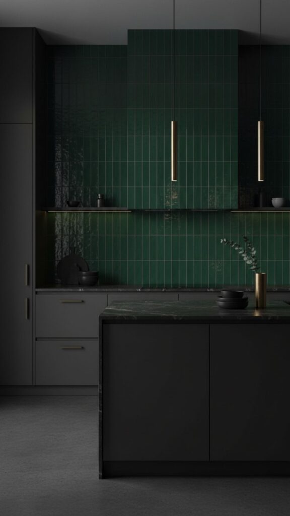 Picket tiles are the edgy cousin of the subway tile. In a deep glossy emerald, they bring a moody, organic sophistication.