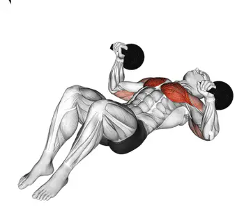 - Lie flat on the floor holding two kettlebells beside your chest.