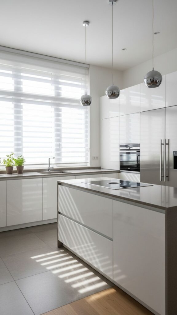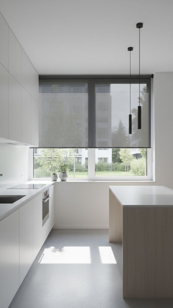 Solar shades reduce glare and heat without blocking your view of the outside. This continuity between indoors and outdoors helps the kitchen feel larger.