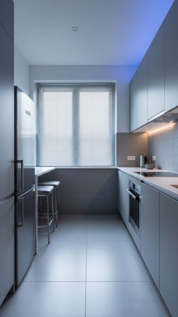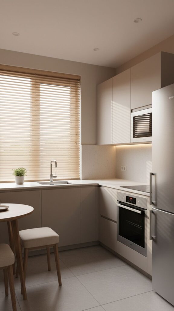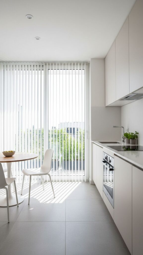 If your small kitchen opens to a patio, vertical blinds draw the eye upward, emphasizing vertical space and height rather than the lack of floor area.