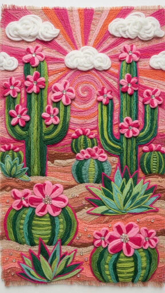 - Use textured stitches like French knots to mimic the prickly surface of a cactus.