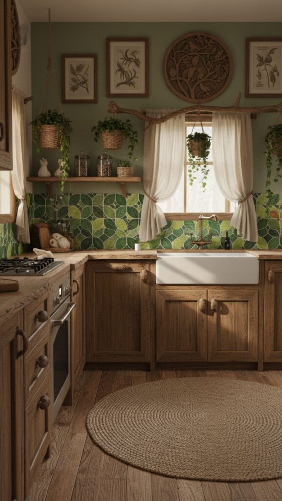 - Use earthy tones: browns, moss greens, and muted yellows.