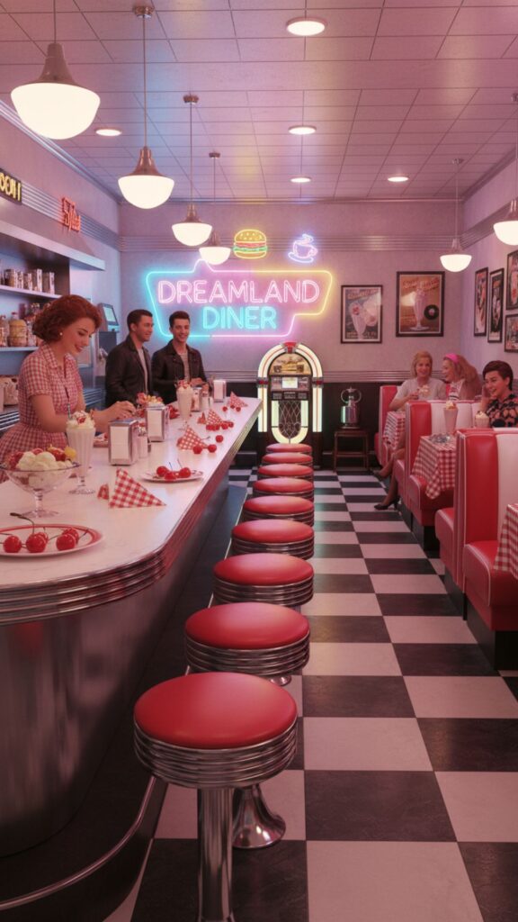 Channel the 1950s diner aesthetic with bright reds and playful fruit patterns.
