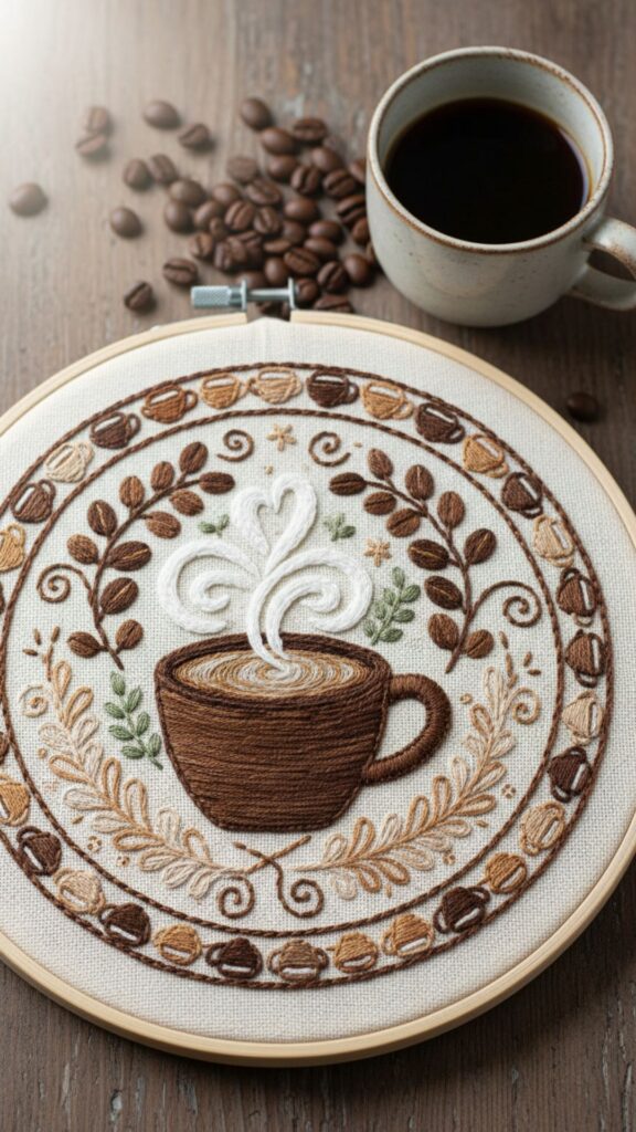 - Stitch phrases like “But First, Coffee” or simple steaming mug outlines.