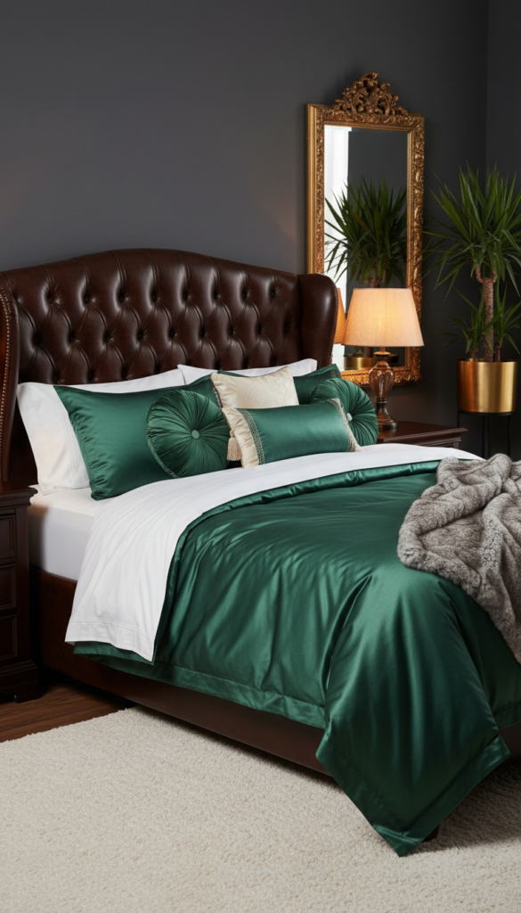 For added luxury, a bed with an upholstered headboard in velvet or leather brings both style and comfort. Choose a neutral or jewel-tone shade, such as deep emerald green, royal blue, or classic black, for a statement piece that adds to the overall aesthetic.