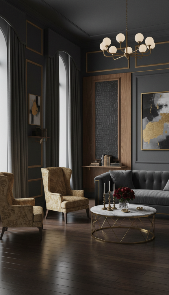 You can also add textures to the walls with wallpaper in subtle patterns or wall panels in wood or faux leather for added richness. Silk or velvet drapery complements these wall textures, creating an elegant contrast to soft fabrics and adding to the opulence of the space.