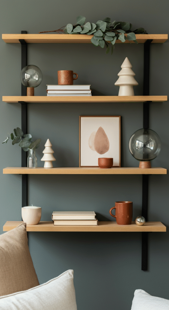 Shelves often get ignored during holiday décor, but they’re perfect places to incorporate modern cozy accents without clutter.